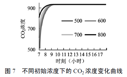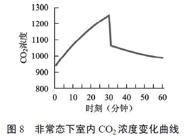 由圖7 可知,在人員CO2散發(fā)量為0.0144m3/(h·p),新風CO2濃度為400ppm 下,對于不同的室內CO2初始濃度,室內CO2濃度最終穩(wěn)定在933ppm,穩(wěn)定時間大約為2 小時。