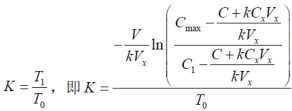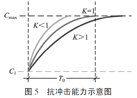 抗沖擊能力是無因次參數,是指在非常態(tài)人流量情況下,CO2濃度由正常控制濃度C1 上升到報警濃度Cmax所需要的時間T1與非常態(tài)人流量持續(xù)時間T0 的比值,用參數K 表示,如圖5 所示,,式中Vx為常態(tài)人流量下的新風供應量,m3/h。