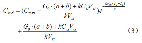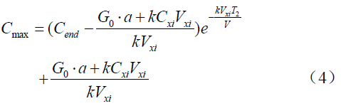 超限時間是指室內CO2 濃度超過報警濃度的時間長度,包含非常態(tài)時段內CO2濃度超過報警限值的時間段(T0-T1)及非常態(tài)結束后CO2濃度在常態(tài)新風量供應下又回落到報警濃度限值的時間段(T2)兩部分。非常態(tài)結束時刻室內CO2濃度為式(3),然后在常態(tài)新風量供應下,CO2濃度回落到報警濃度,如式(4)。