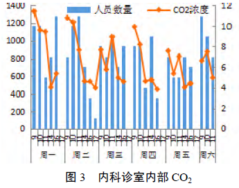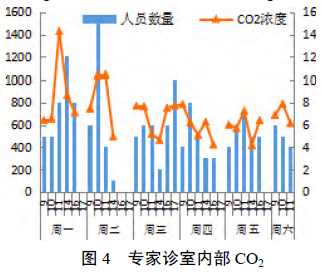 在測試時發(fā)現室內開啟了機械新風系統(tǒng),其新風量為2h-1 換氣次數,同時診室的門窗一直處于開啟狀態(tài)。由圖3 和圖4可以看出,診室內部的人流量與室內CO2濃度呈正相關,在具有機械新風系統(tǒng)供應新風及開啟外窗的情況下,診室內部CO2 濃度在某些時段超過了《室內環(huán)境空氣質量標準》(GB/T18883-2002)規(guī)定的1000ppm 限值,具體表現在內科診室是周一至周四的上午時段,最高達到了1300ppm,而專家診室則是在周一與周二,最高達到了1400ppm。與醫(yī)護人員訪談得知診室在周一與周二的上午時段室內人員較多,空氣質量較差,有醫(yī)護人員甚至發(fā)出“在這種悶悶的環(huán)境中怎么能打起精神來給患者看病”的感慨。由此可知,診室雖然開啟了新風系統(tǒng)且新風量為2h-1換氣次數,診室內部仍感覺空氣質量不好,不得不打開外窗以引進新鮮空氣,在這種情形下室內的空氣質量仍有部分時段不佳。