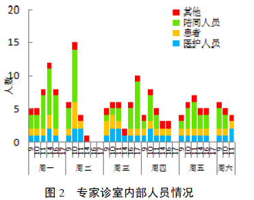 該醫(yī)院制定了門診就診管理制度,一次只允許一名患者和一名陪同人員進入診室,但從實際的情況來看,如圖1 與圖2,診室內部的醫(yī)護人員和患者的數量比較穩(wěn)定,一般為三人,分別為一名醫(yī)生、一名助理和一名患者,而陪同人員數量較多且變化較大,陪同人員最少為0 人,最多為6~8 人。由此可知該醫(yī)院雖然設置了管理制度,但沒有嚴格執(zhí)行,導致了診室內部人員遠遠偏離了正常情況。通過與醫(yī)護人員交談發(fā)現,診室內存在兩類不確定的人員,一類是正在診療患者的陪同人員,有時陪同數量較多,大約為5 人,尤其是兒童患者的陪同人員;另一類是正在等候診療的患者及其家屬(即圖中的“其他”人員),他們會擠進診室等待就診,雖然醫(yī)護人員讓這些等候人員在診室外等候,但效果并不明顯。