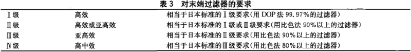 我國標準對Ⅰ~Ⅳ級醫院潔凈用房的末端過濾要求見表3。