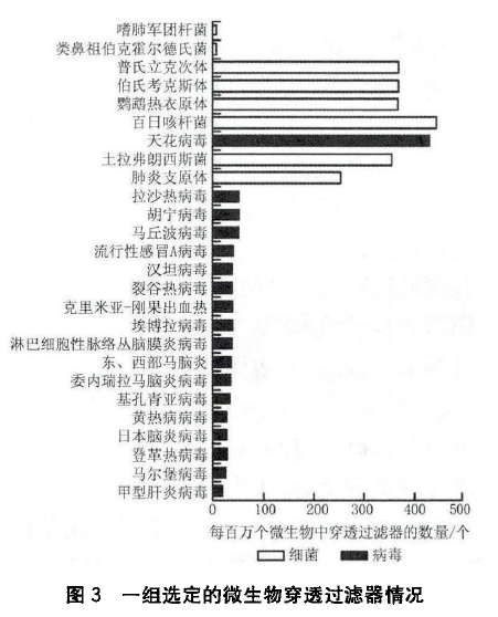 , 19%~24%為3~6µm, 僅有10%~11%小于3µm,所以小于0.1µm的粒子所帶病毒非常少。而高效過濾器對小于0.1µm的粒子也有較高效率,見圖1,2[3]。圖3顯示了一組選定的微生物穿透過濾器的情況[4],可見穿透過濾器的病毒與細菌并無太大差別,因為病毒的載體也不小,而小粒徑也并不是高效過濾器的最易穿透粒徑(也有99.9%以上的效率),所以不是粒徑越小越容易穿透過濾器。
