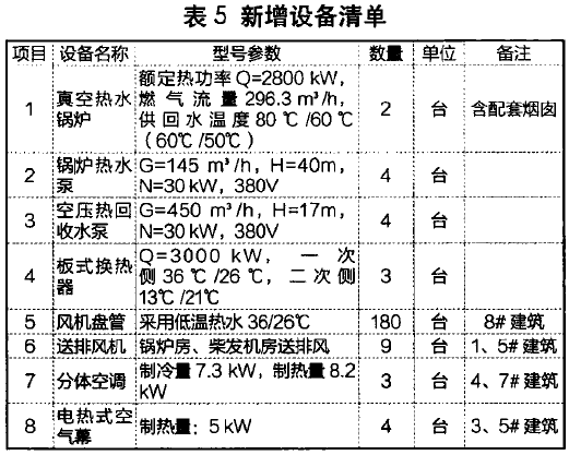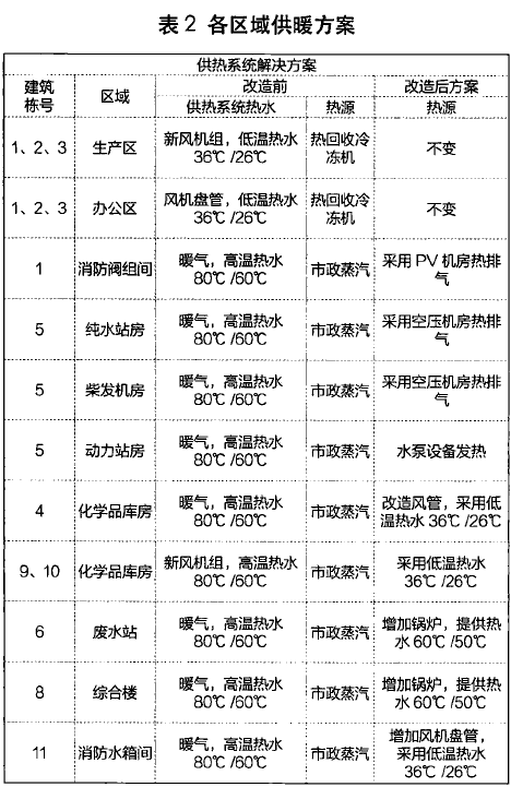 優先回收利用生產線內的廢熱,包括空壓廢熱和冷凍機冷凝廢熱,不足部分采用新增燃氣熱水鍋爐補熱,對于不同區域重新制定供暖方案,表2: