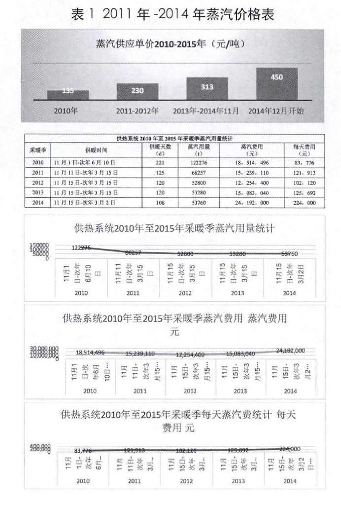 在工廠投建前,開發區管委會配套建設了路東區7號供熱站,該供熱站安裝有3臺35t/h的蒸汽鍋爐,由北京博大開拓熱力有限公司負責運營為工廠供應蒸汽。首次供熱于2010年11月開始,因廠房正進行工藝設備搬入,潔凈廠房內沒有發熱量,沒有可回收熱源,所以當時全廠的采暖熱源為市政蒸汽,蒸汽峰值用量達80 t/h,確保了工廠工藝設備按時搬人與調試。2013年,伴隨著工廠120K擴產完成后,生產線余熱回收量增人,基本滿足潔凈廠房的供暖需求,2013年至2014年采暖季,蒸汽用最已降至5.5 t/h左右,但按供熱臺同要求,從安全供應蒸汽考慮,供應量最低為20 t/h,工廠消耗不完的蒸汽須在廠內進行排空,造成大量能源浪費和環境污染。自2011年起,受天然氣漲價等因素,北京經濟技術開發區的蒸汽價格持續上漲,表1為2011年~2014年蒸汽價格對比表。