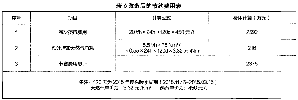 項目改造完成后, 實現徹底停用市政蒸汽,每年減少費用2592萬元,新增鍋爐后,每年增加燃氣費用216萬元,合計每年減少2376萬元,詳見表6。