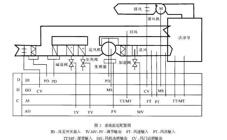 2.4狀態(tài)監(jiān)測:風機啟動后,風機兩側壓差超過設定值時,風機DP開關閉合,信號輸入系統(tǒng),控制程序投入運行。同時風門及電動調節(jié)閥送電。反之,當風機停止后風門及電動調節(jié)閥關閉。通過風機過載繼電器狀態(tài)監(jiān)測,產(chǎn)生風機故障報警信號(D D。通過空調控制柜的二次回路監(jiān)測風機的運行狀態(tài)信號(DD。通過與變頻器指定接線端的連接,監(jiān)測變頻器故障報警信號(D D、變頻器運行狀態(tài)信號(DI)、變頻器頻率反饋信號(DI)。通過安裝微差壓傳感器(QBM 63/100)監(jiān)測房間送風口高效過濾網(wǎng)的壓差(AI)。通過安裝壓差開關QBM81 -5,監(jiān)測空調機組上粗效和中效過濾網(wǎng)兩側壓差(2*D I),根據(jù)預先設定的壓差限值產(chǎn)生阻塞報警信號,提示清洗過濾網(wǎng),提高過濾效率。一般壓差設定值為20:-500Pa,可根據(jù)不同機組調整報警范圍。