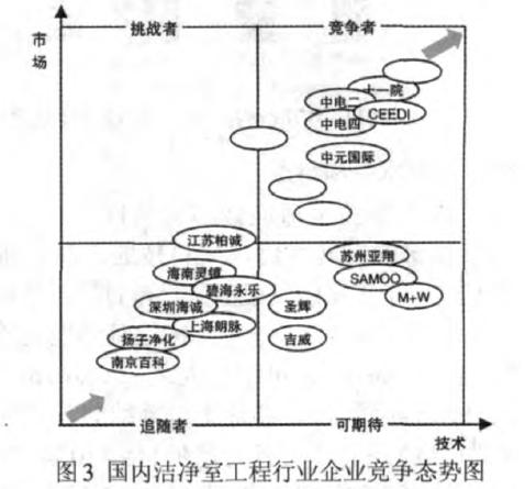 隨著整個潔凈室工程行業競爭的日益加劇,大多數企業在整體競爭的基礎上不斷細分市場定位,在不同行業中爭取占據領先地位。例如,在電子信息領域,集成電路潔凈室工程設計方面一路領先的是信息產業電子第十一設計研究院;液晶顯示器生產線潔凈室工程設計方面領先的則是中國電子工程設計院(CEEDI);而中國電子系統工程第二建設公司與第四建設公司則在具體的工程實施方面有較強的優勢和豐富的經驗;碧海永樂、嘉合則主要集中在太陽能電池領域;相對而言,具有臺資背景的亞翔、漢堂因起步較早,因此在技術積累和現場施工經驗方面比較突出。在醫藥衛生行業潔凈室工程方面市場占有率較高的企業則有中元國際、中國石化集團上海工程有限公司、海南靈鏡、江蘇久信、江蘇環亞、中國電子系統工程第二建設公司與第四建設公司、上海朗脈等。目前,企業在競爭中逐漸形成了自己的核心競爭力(技術創新、技術特長、綜合實力),力求在整體競爭中占據有利地位,根據電子學會綜合評定,以市場占有能力和技術能力為依據,編制了整個潔凈室工程行業的競爭態勢圖如圖3所示。但這只是一個市場宏觀動態趨勢圖,并不代表對公司的評價。