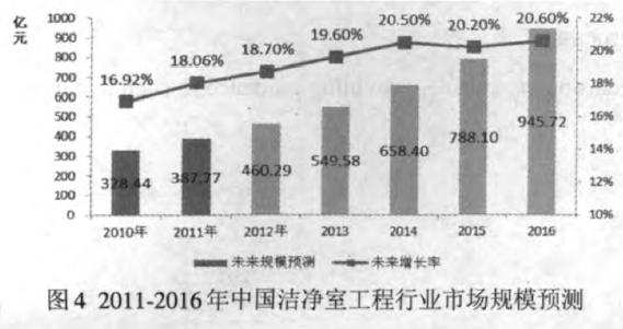 近年來隨著我國電子信息、醫藥衛生、航空航天、精密儀器、化工、食品等行業的持續增長,我國潔凈室工程行業正迎來一個新的發展期,市場需求規模不斷擴大。特別是新版GMP-2010的發布和醫療改革的實施,極大地推動醫藥制造和食品行業的潔凈室需求及醫療受控環境的需求,從而帶動整個潔凈室工程行業市場規模的擴大,行業的景氣將會因市場對潔凈室需求的旺盛得到較長時間的維持。根據中國電子學會的預測,到 2016 年,我國防靜電超凈技術產品的市場規模將由2011 年的387.77 億元增至 945.72 億元,年均復合增長率在19.52% 左右(見圖 4)。行業市場規模的持續擴大為行業領先企業提供了巨大的發展機遇。
