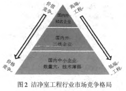 目前,我國潔凈室工程行業已經形成了金字塔結構的市場競爭格局(見圖 2)。在電子潔凈室工程等高端市場以國際領先企業和少數幾個國內技術領先企業為主。一些在大陸投資設廠的國外企業會將其潔凈室建設交由與其有多年合作關系的國外公司承擔,如歐美和日韓的一些半導體企業出于多年合作的關系,其在大陸投資的潔凈室項目常常由本國的一些有多年合作關系的企業建設實施。但是隨著我國相關潔凈室企業技術能力的提升,很多國外企業出于成本的考慮,已經逐漸將其潔凈室交由我國的一些大型工程公司實施。